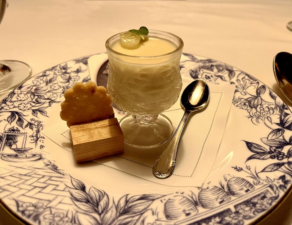 开场的小点轻盈而诗意,来自花园的法式杂菜煮,伴以烤蒜奶冻,盛于细致如瓷的蛋壳中。蔬菜的甜、蒜的香、奶的柔,像是序曲的第一个和弦,轻轻唤醒味蕾。