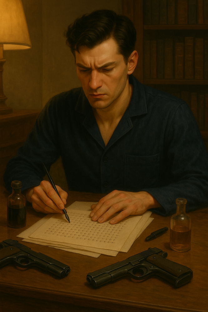 回到客厅,把一支枪和烟盒揣进了裤兜,另一支枪放进了写字台中间的抽屉。突然想起什么,把刚才誊写密码的稿纸,撕下了六七张,仔细看了一下,后面的纸上没有了漏下来的笔痕。把密写液放回书架,拿起碘酒和字典,到客厅先把团在手中的空白稿纸,在熄灭炉火的壁炉里,掏出烟盒用打火机点燃,看着化为灰烬。去父母和弟弟房间放回碘酒和字典,在弟弟房间门外,如释重负的吐出一口气。