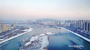 江畔青青垂柳,高楼两岸云霄。横空飞渡一长桥,水里游轮鸣叫。