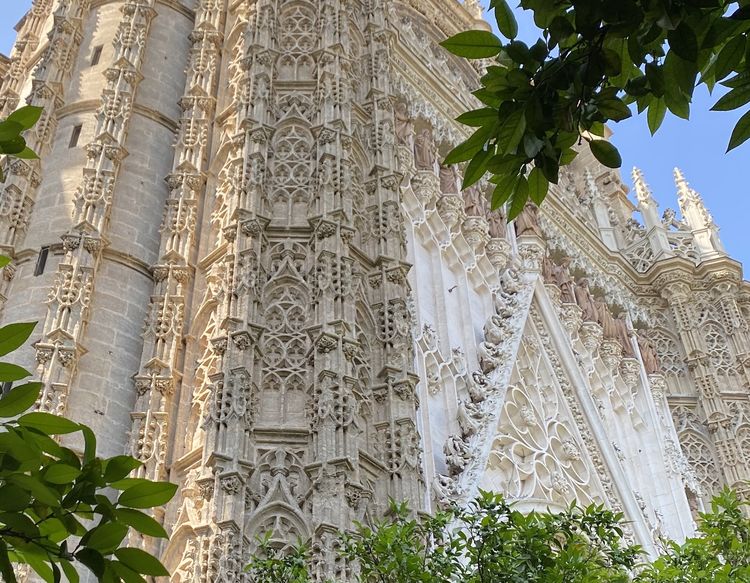 首先,是吉拉尔达(Giralda)钟楼,它由原来清真寺宣礼塔改建而成。哥特式的钟楼,保留了北非穆斯林宣礼塔的元素,譬如阿尔莫哈德时代的装饰, 显得挺拔俊秀,不那么瘦骨嶙峋。塔楼顶尖上,站立着青铜的Giraldillo雕塑,仿典娜女神的形象,显然是文艺复兴的浪漫点睛之笔。这塔楼像是塞维利亚文化混血的一大标志。