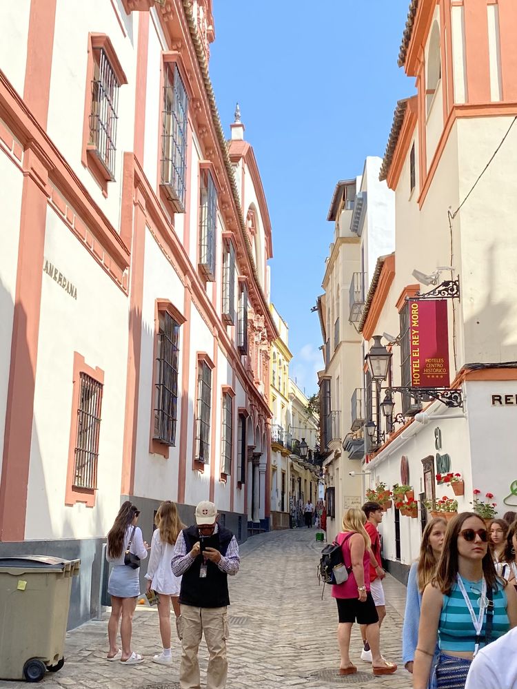 离开西班牙广场,地导(下图,穿红衣者)带我们来到圣十字区(Barrio de Santa Cruz)。中世纪时,这里就是塞维利亚老城的犹太区(Juderia)。我们边走边看边听她讲这里的故事。