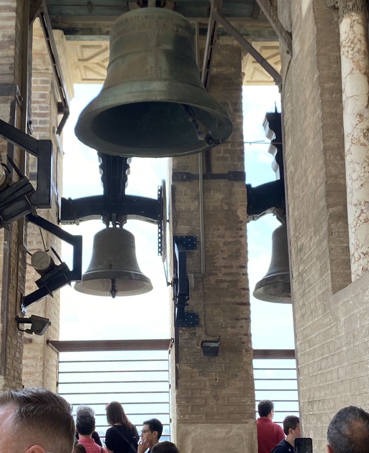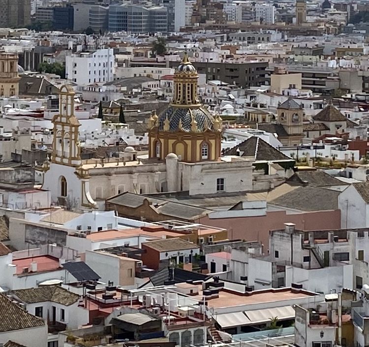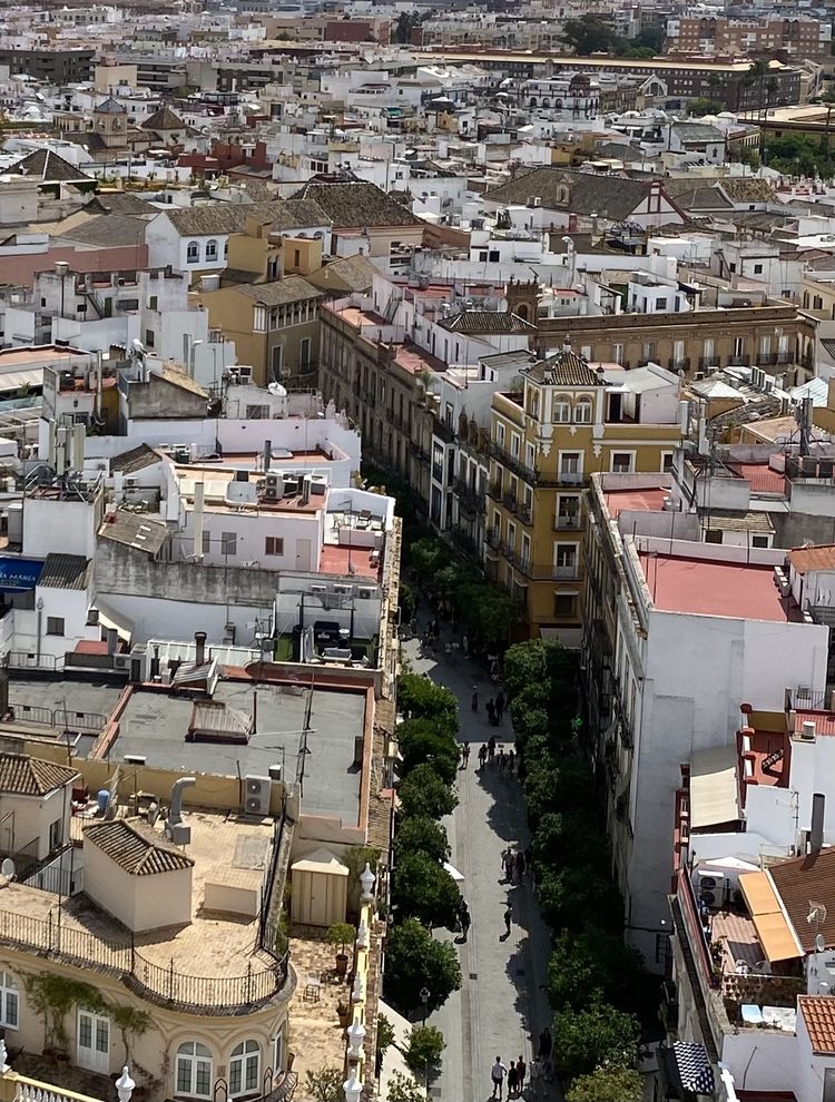 登吉拉尔达钟楼也是快意之事。塔内没有楼梯,我们沿着螺旋形坡道向上攀登,约20分钟,登上70米高的瞭望台,一览塞维利亚。不一样的城景。