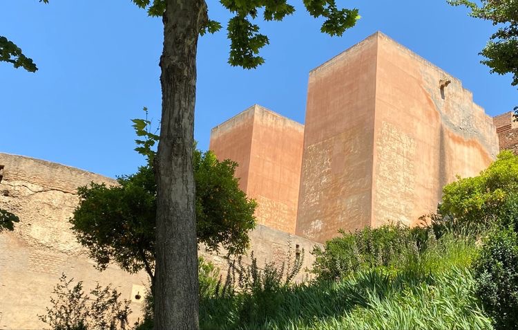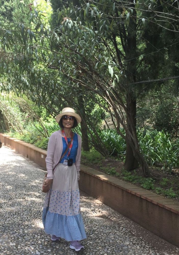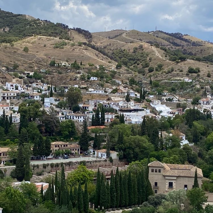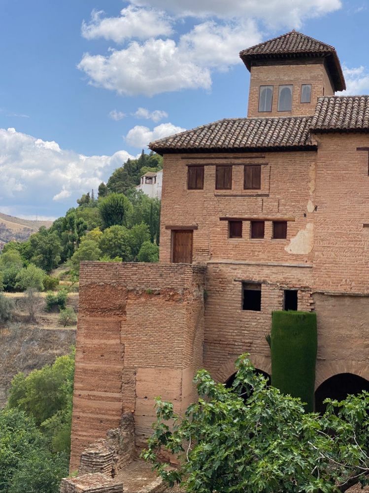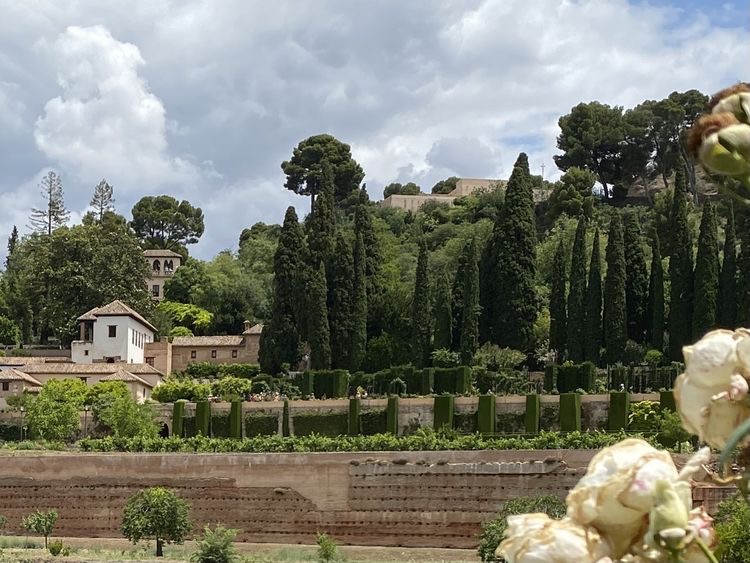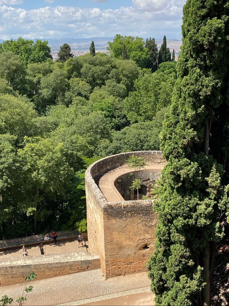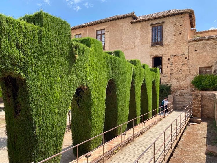 那天,我们跟着导游,沿着格拉纳达城东的上坡路,向阿罕布拉宫走去。一路上,顺坡而建的宅院,山丘上摩尔人堡垒红色砂岩外墙,在绿色植物的映忖下,很像通向遥远历史的引道。
