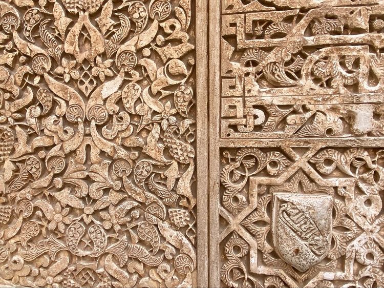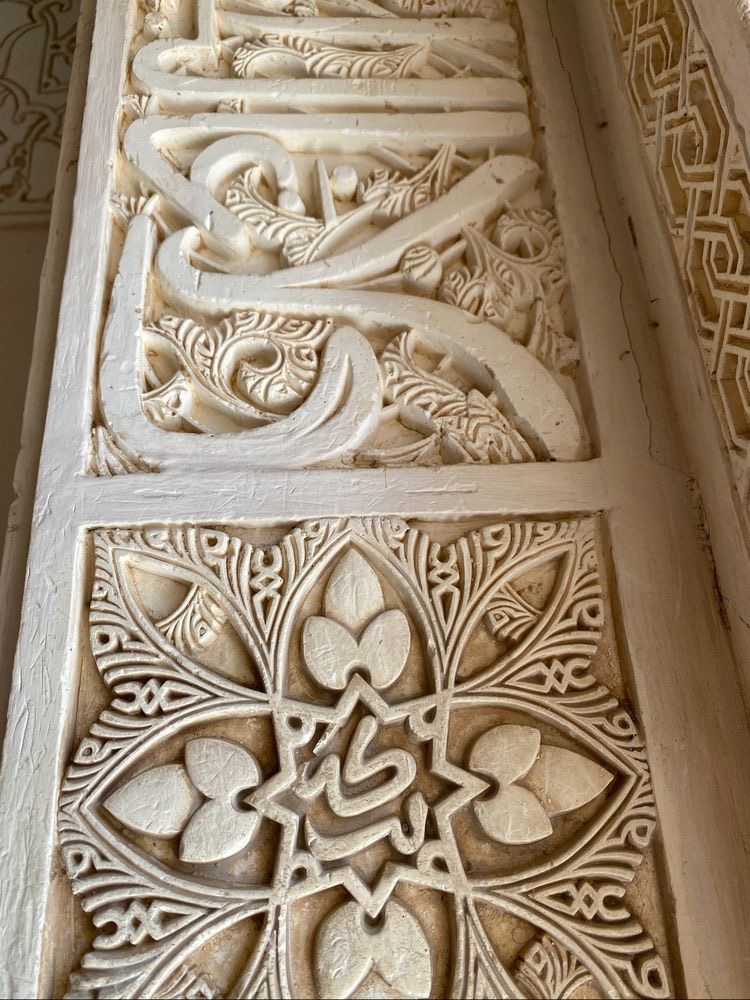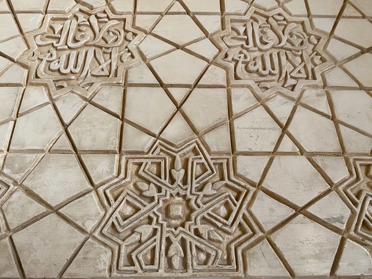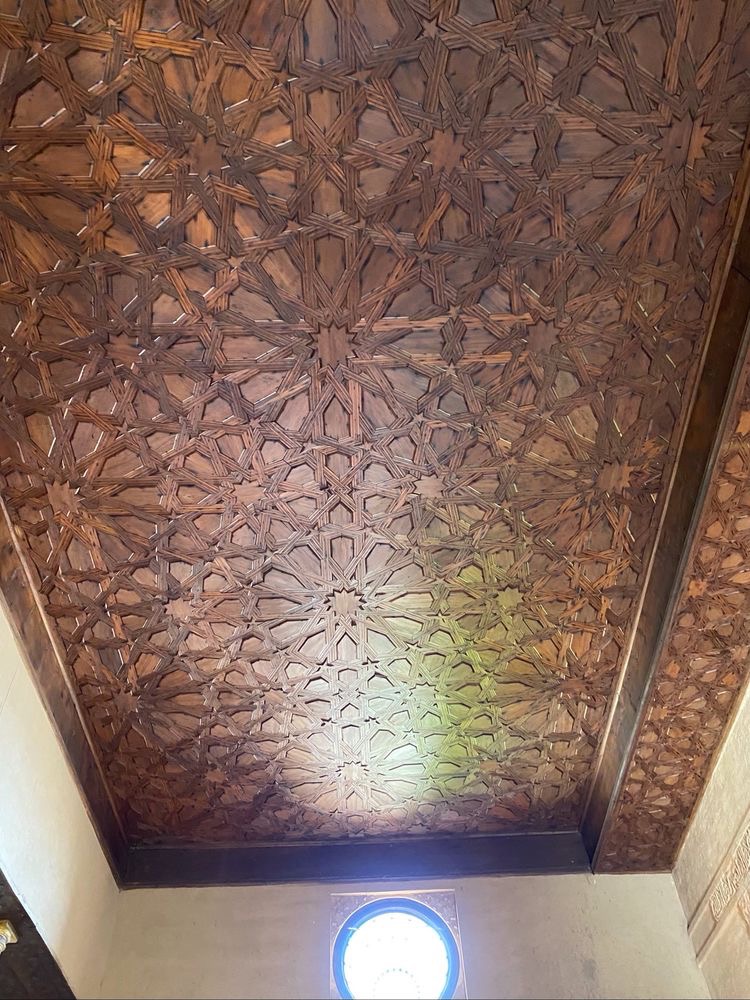 大厅上方的穆卡纳斯(Muqarnas)拱顶,据介绍,能够保证室内空气流通,这是伊斯兰世界最精妙绝伦的钟乳石天花板,蜂巢状浮雕,花样繁多,令人目眩,联想星空。 阳光从屋顶上的窗户照进来,投射出柔和的光线。猜想,这设计与穆斯林文化中洞穴神秘主义有关。