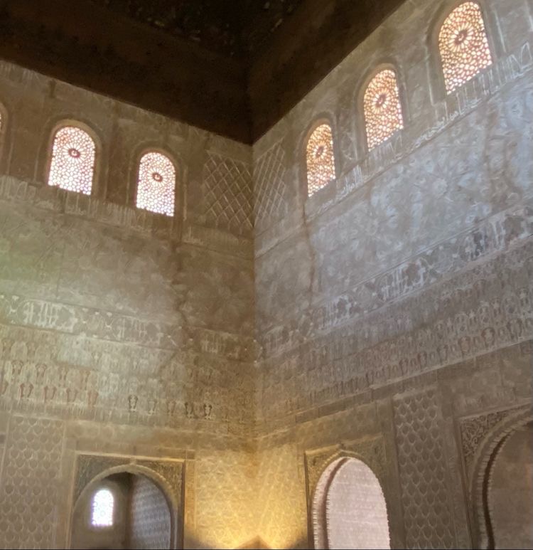 站在厅内,仰头看四周,心想,难怪阿罕布拉宫得几代人努力才能完工 ,整墙的“壁画诗歌”!虽然已斑驳陈旧,阿拉伯建筑和艺术中的三元素:艺术书写、藤蔓花纹和几何设计,清晰可见。尤其是,到处可见装饰性的阿拉伯文字,据说,意思只有一个:“一切归上帝”、“除了上帝,没有胜利者”。这是纳斯里德王室的座右铭。