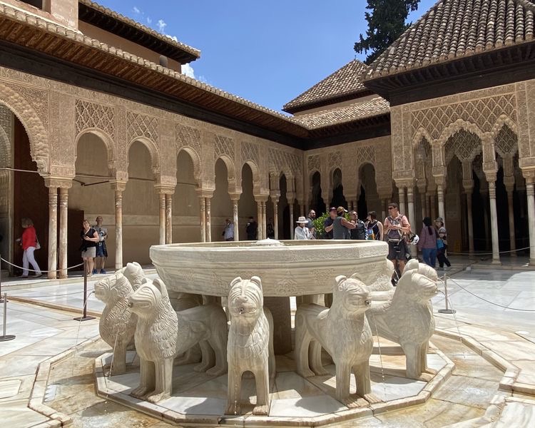 庭院中央有一个大理石喷泉,由12尊吐水的狮子雕塑组成。中央喷泉和四个大厅的较小喷泉通过渡槽连接。