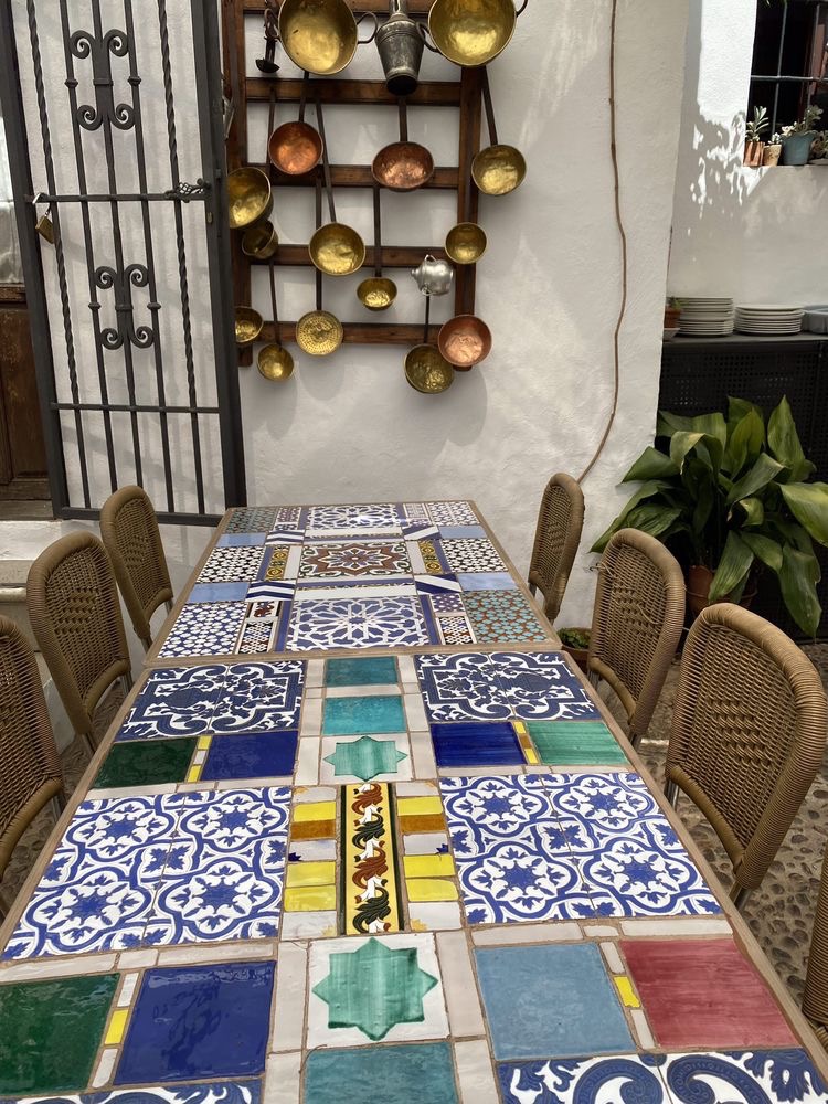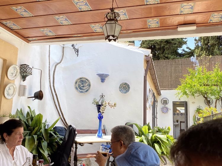 午餐安排在阿罕布拉宫进口处的一家餐厅。饭店的装饰,餐具等,都很讲究,装饰了不少摩尔人的文化元素。心想,是不是摩尔人的后代的后代开的? 可能性非常小。摘一段华盛顿·欧文的书:“1492年,信奉天主教的西班牙国王费迪南德二世和王后伊莎贝拉征服了伊比利亚半岛最后一个穆斯林王国——格拉纳达。格拉纳达投降的条件是,当地居民可以得到西班牙境内其他穆斯林享有的权利。可是,过了不久,西班牙的统治者就加强对国内穆斯林的迫害,强迫他们改信天主教。1499年,当地的穆斯林发起暴动,抗议西班牙人违反协议。政府派出军队平息了这次骚乱。此后不久,各地的穆斯林陆续被迫改信天主教,不肯屈从的都被驱逐出境。西班牙人把那些选择改信并留下来的穆斯林称为‘摩里斯科人’。”