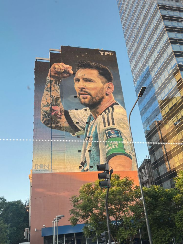 接近七月九日大道的贝尔格拉诺大道上,阿根廷足球明星的巨幅壁画,是这个城市最重要的新风景。2022年12月18日,梅西带领的阿根廷队赢得了世界杯冠军。据说,那天阿根廷举国欢庆,场面之大令全世界为之震撼。一年后,这幅令人振奋的梅西壁画,风头盖过了离其不远的贝隆夫人雕像。