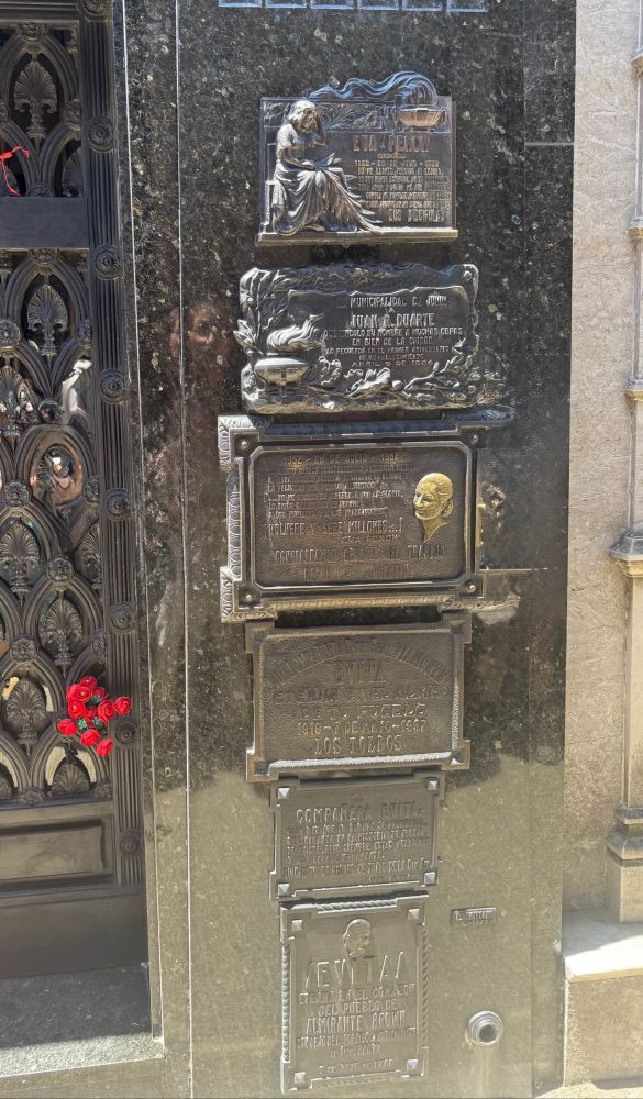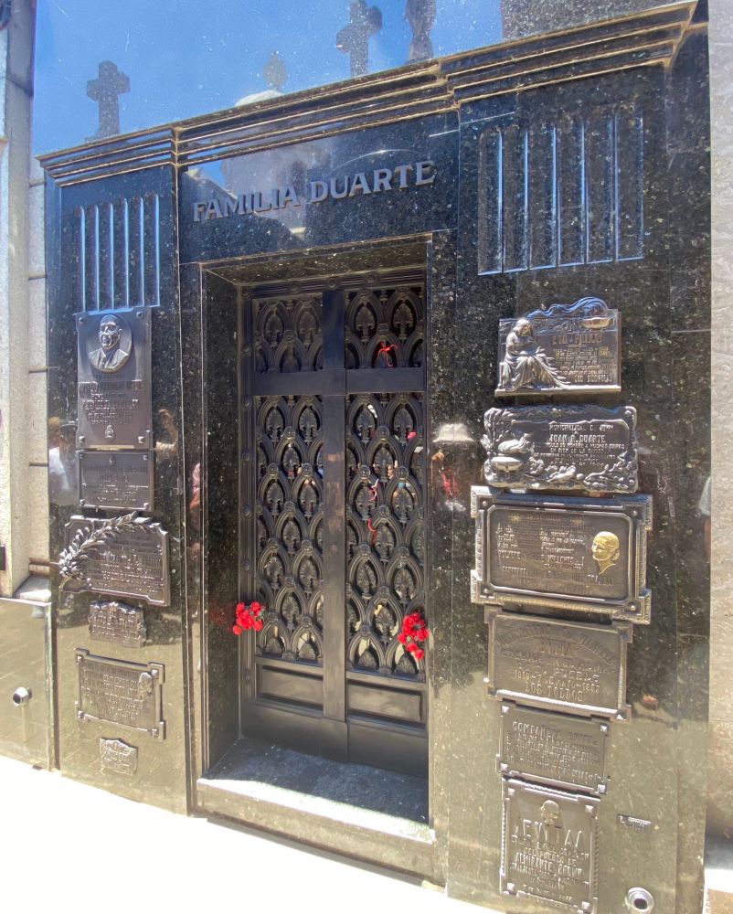 大太阳下,公墓里很热闹。导游直接把我们领到贝隆夫人幕前。她没有与贝隆先生葬在一起。看墓碑上的字,这墓地属于Duarte家族。据介绍,是他们捐出这个墓穴,让出生下层的她安葬在这个贵族陵园。看来,她生前不受上流社会的待见,死后倒得以与他们为邻。这天,贝隆夫人陵墓上的鲜花,没有想象的那么多。