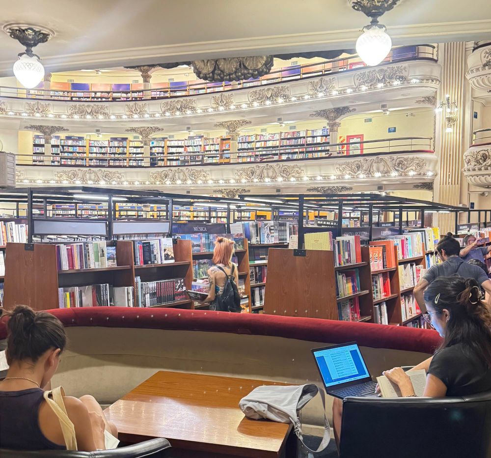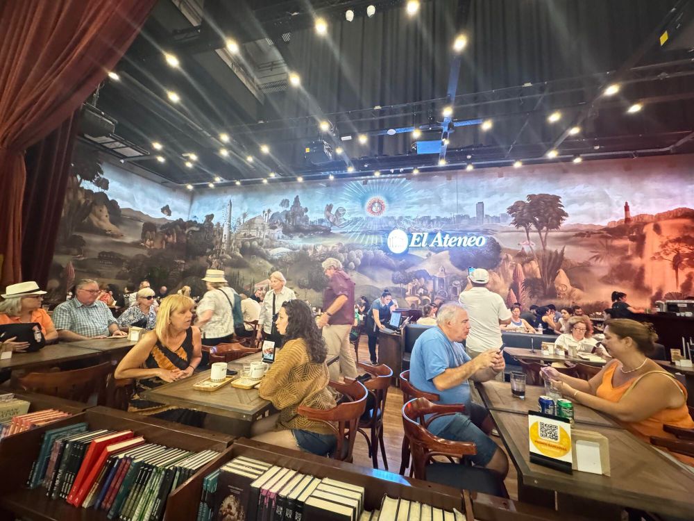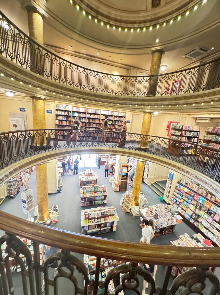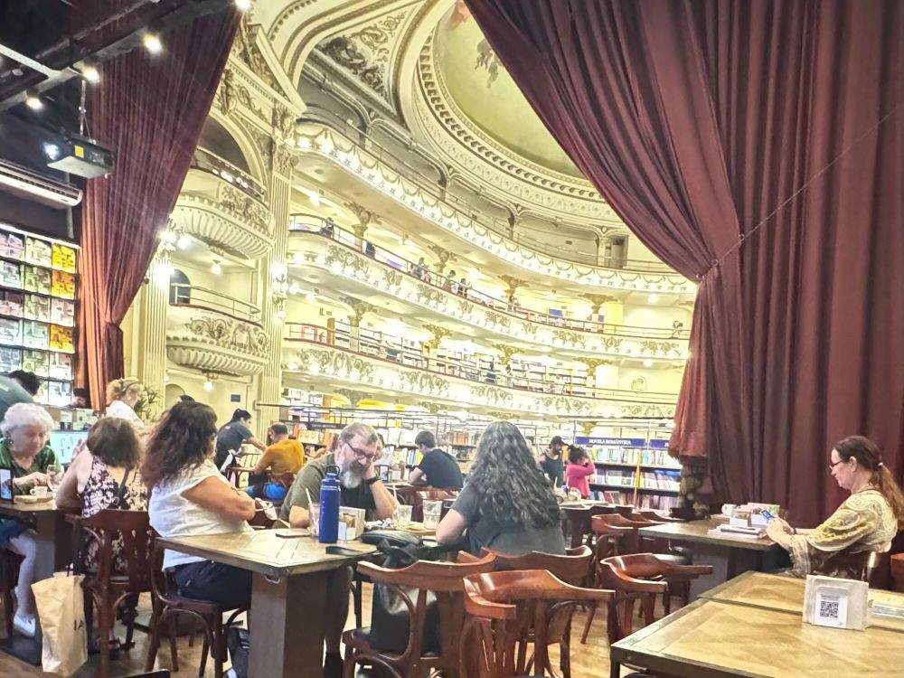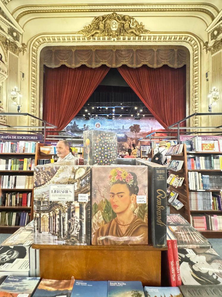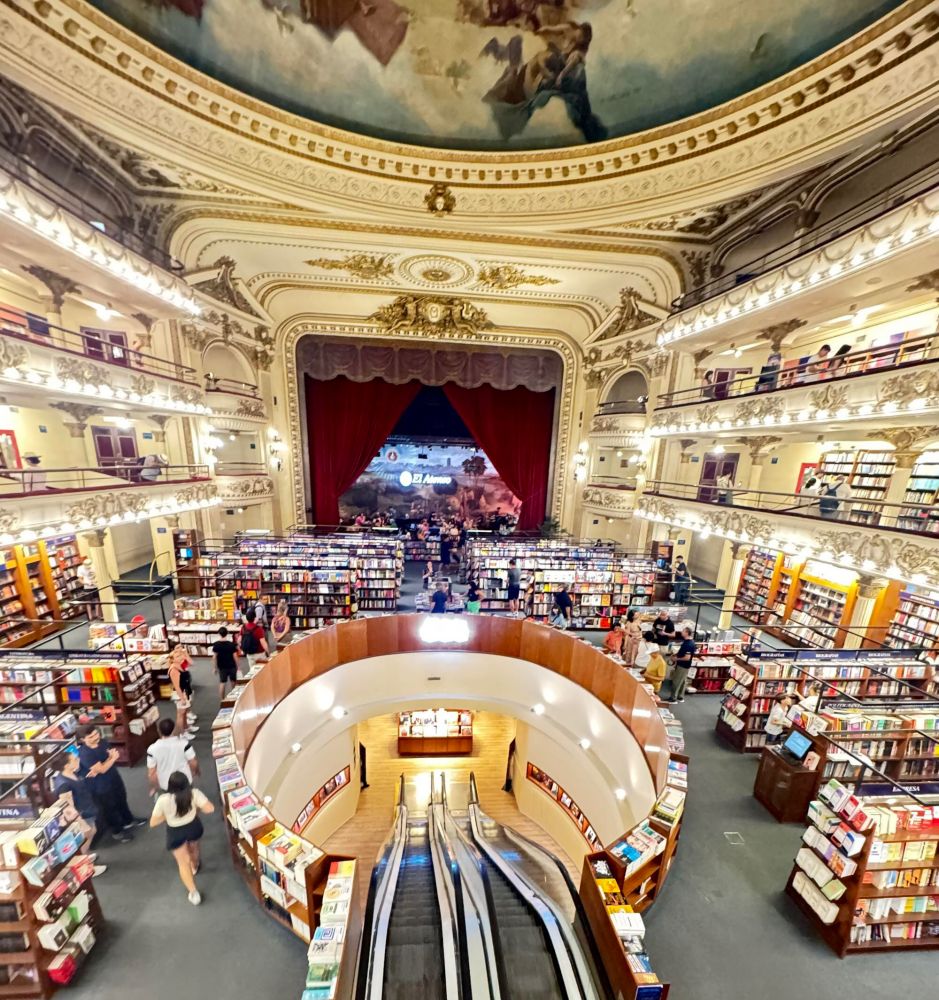 除了科隆大剧院,华美的El Ateneo 书店也吸引无数游客。这是一座由剧院改建而成的书店。金碧辉煌,宏伟大气的戏院建筑里,优雅的包厢和天花板壁画,衬托的是一排排书籍,知识的海洋。在葡萄牙波尔图看到的莱罗書店(Livararia Lello),与之相比,显得过于拥挤,原本心目中世界上最美书店的地位,动摇了。