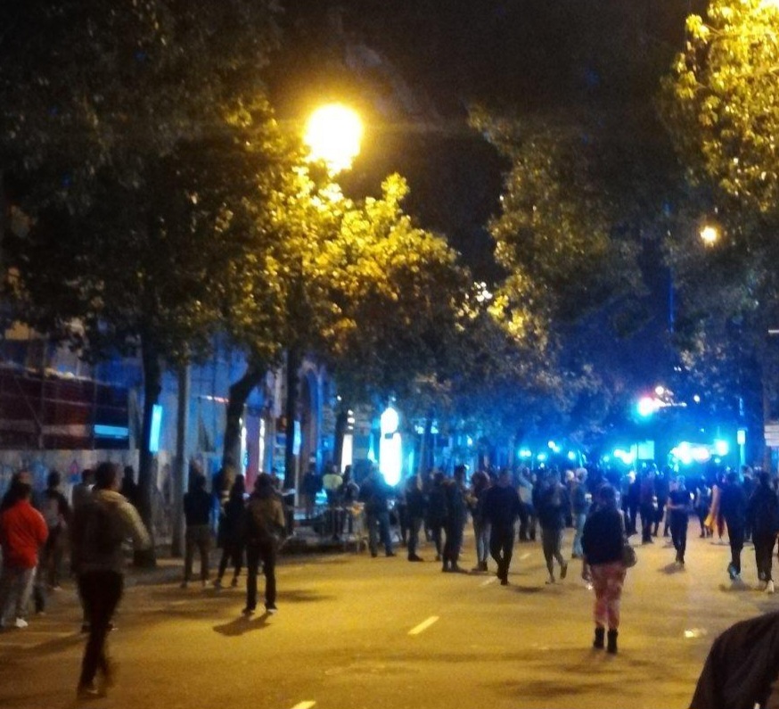效率还挺高,半天就参观完了叶奥·莫雷拉之家、阿马特耶之家、巴特罗之家、米拉之家、圣家族大教堂等几个景点。意犹未尽地朝回走,回到加泰罗尼广场已是晚上10:30了。忽然发现情形有些异样,广场边上停着许多警车,周围站着大批警察。身着黑色制服的警察,黑魆魆的一片,在暮色下,看着瘆人。朝东走,路上警察越来越多。临近旅店所处的南北路,一片吵杂声传来。抬眼望去,示威的人群与警察厮打在一起,短兵相接,警察们胸前居然挂着冲锋枪!我想紧走几步,快速拐进旅店,被太太厉声制止了。戒严了,警察往西驱赶着行人。我们随着人流拐进了西边一条朝南的小巷。走到街的南端,那里依然戒严。看着我们紧张焦虑的神情,一位行人用非常轻松的口吻,安慰说:“It’s usual”。并让我们退回小巷,看看那里旅店有没有后门。没有,我们失望了。又有一位好心人,领着我们去和戒严的警察交涉,警察以危险为由,和蔼地拒绝了我们回旅店的要求。问需要等多长时间,回答说可能要3、4个小时。带着头盔的防爆警察肩并肩地站成一排,堵住了朝东的路,我们只好往西撤。形势更紧张了,一架直升飞机在空中盘旋。突然戒严方向传来清脆的枪声!太太异常兴奋起来:“机会难得,照几张像吧”,说完折身往回走。我躲在一大树后面,冲她嚷:“别照了”。她依然兴致不减地拉我出来录像,一边录一边还解说着。不少看热闹的行人站在警察对面围观,一位记者模样的年轻姑娘拿着手机对着警察录像,并慷慨激昂地演讲着,围观的人群中不时发出阵阵附和声。