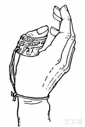 韘也该是成人用的,它是射箭时用的工具。下图的韘从商代妇好墓里出土,套在大拇指上,那一个凹槽可能是用来卡弓弦的。