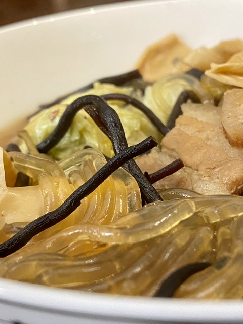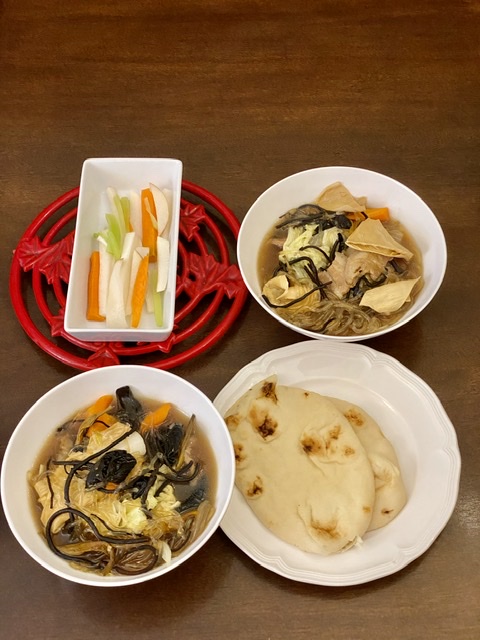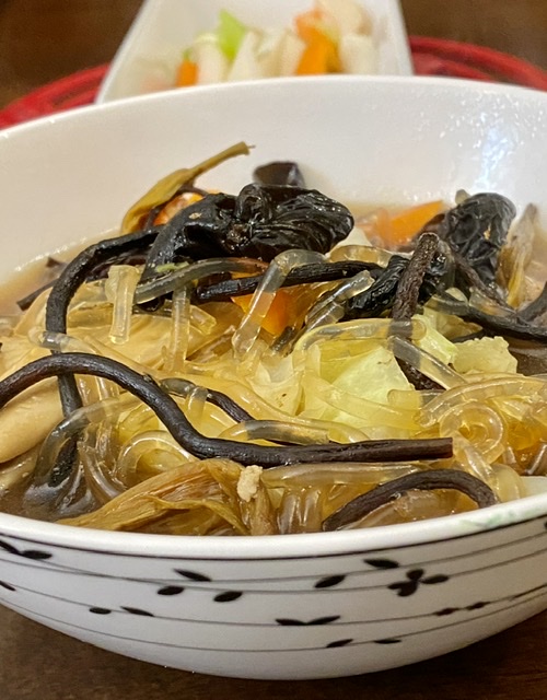 今天有地瓜粉条、白菜、黄花菜、木耳,豆腐皮、五花肉、胡萝卜、羊栖菜。