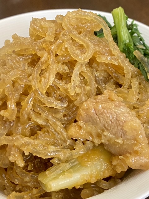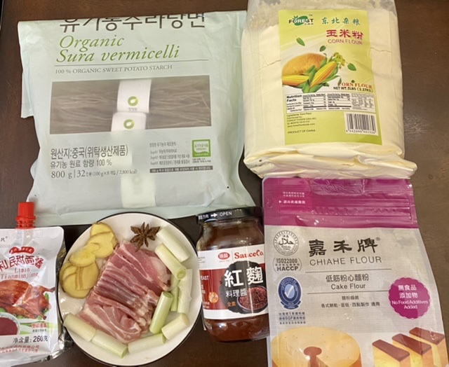 肉片跟葱姜,甜面酱,酱油,红曲酱(这个我自己发挥的)搅和在一起。