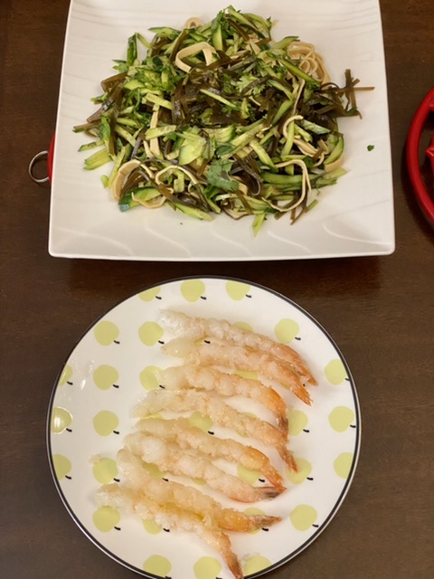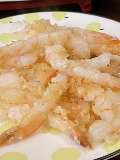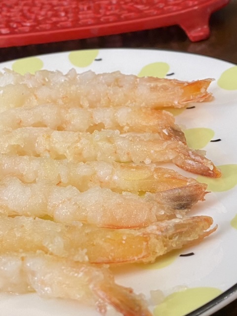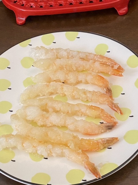 虾用粗粒地瓜粉+豌豆淀粉,盐,粘上粉,煎一下。