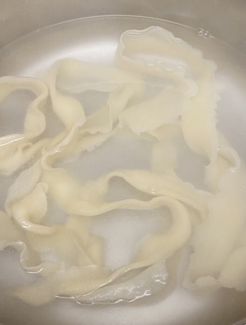 做时拿一片,中间用筷子压个印,两头拿起来抖、抻,在案板上甩,变薄变细了就从筷子印撕开,放开水锅里。