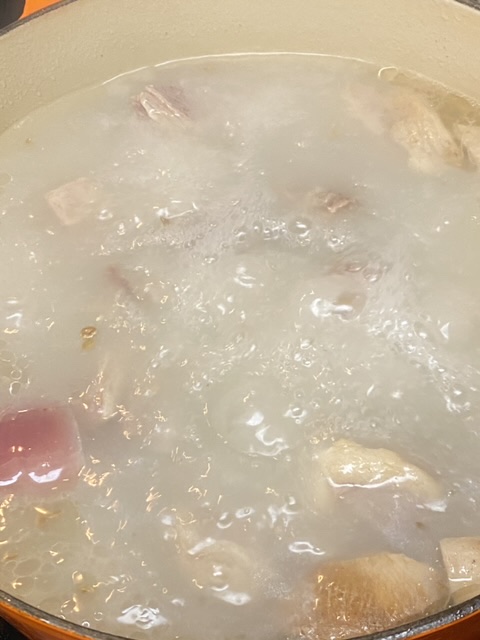 羊肉汤是肚腩排加羊腿肉,焯洗(焯水完用热水清洗,避免肉一冷一热)以后,加开水炖,开水能让汤变白。