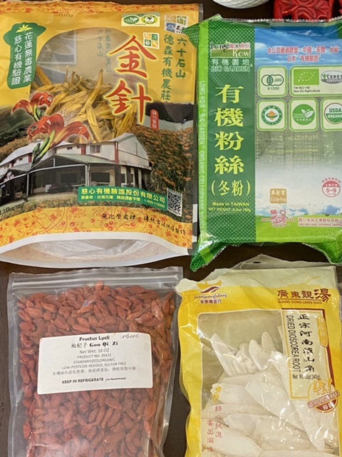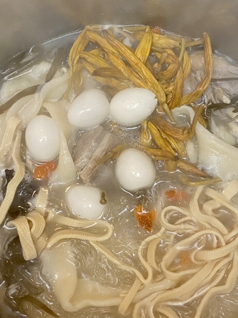 淮山药干羊肉煮一半放进去,淮山没中药味。其它的泡水。最后烩面的时候放。