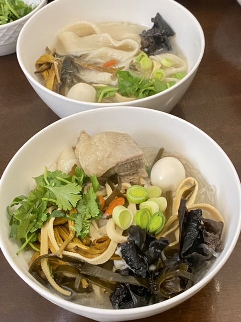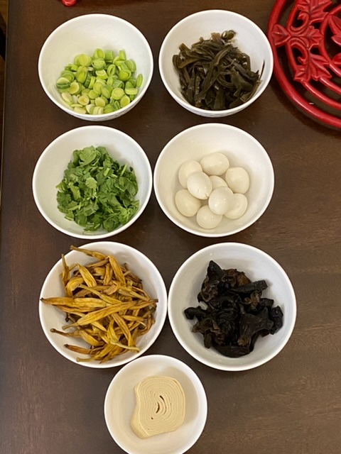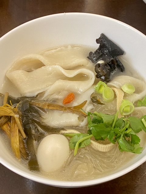 烩面里面有粉丝、海带丝、黄花、木耳、豆腐丝、鹌鹑蛋、枸杞。这个是烩面标配。