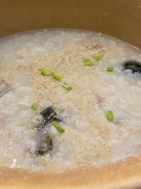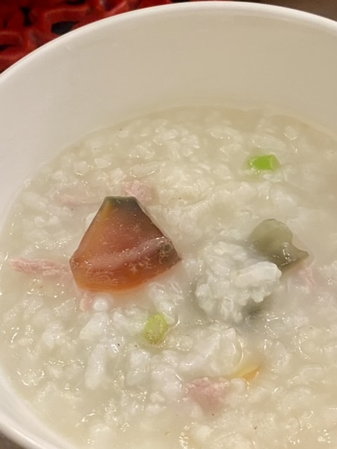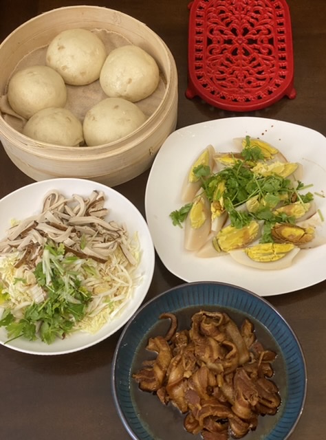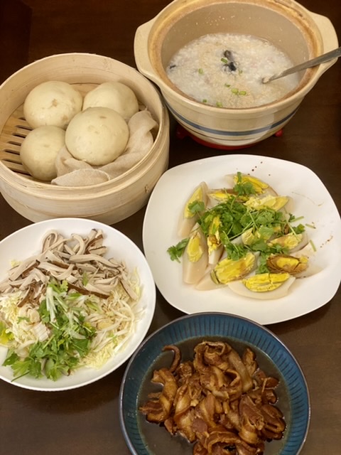 凉拌煮鹅蛋、香干白菜心(用糖醋蒜的醋拌)、带皮黑豚五花肉,因为买的是切长片的,所以就直接在高压电饭煲做了一下。汤没收,留着蘸馒头。