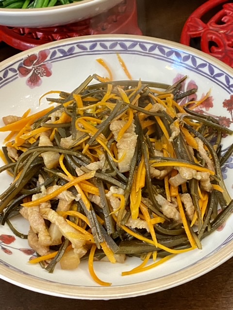 今天最喜欢的海带胡萝卜丝炒肉丝,海带和胡萝卜丝软糯,肉丝很香。