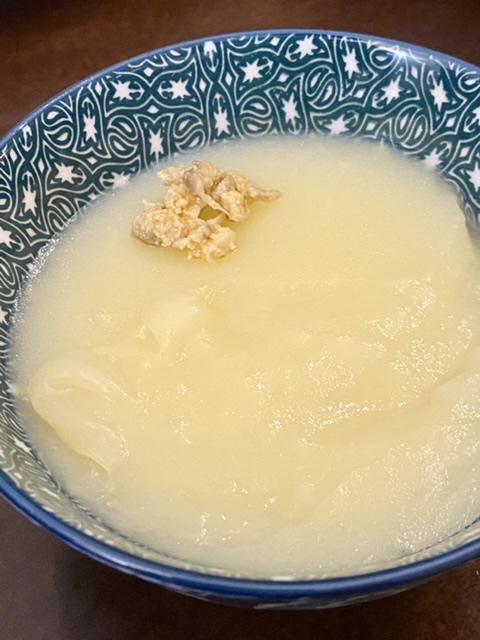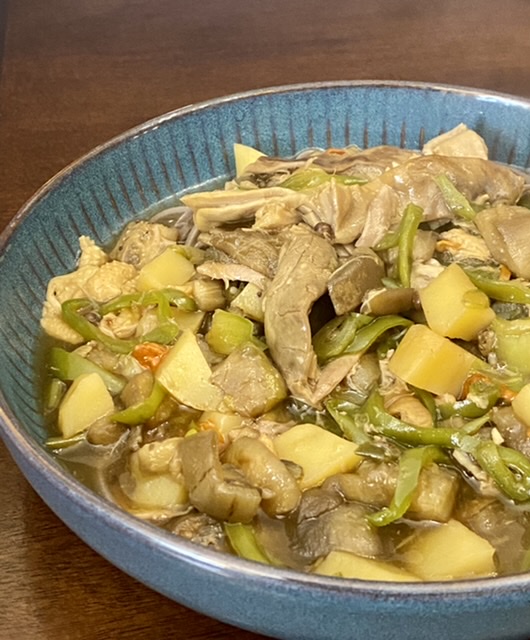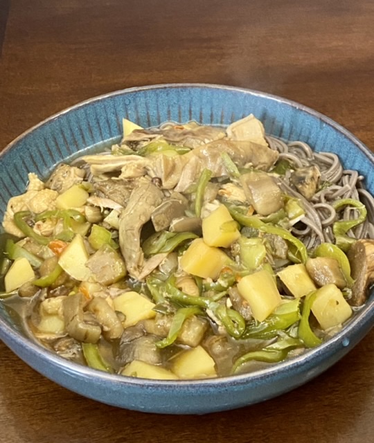 猪肚鸡汤煨茄丁、土豆丁,最后勾芡做卤,荞麦面。