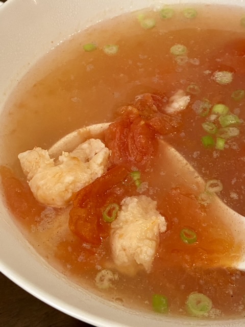 西红柿虾滑汤,西红柿捣碎,直接煮就行,不用油。