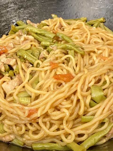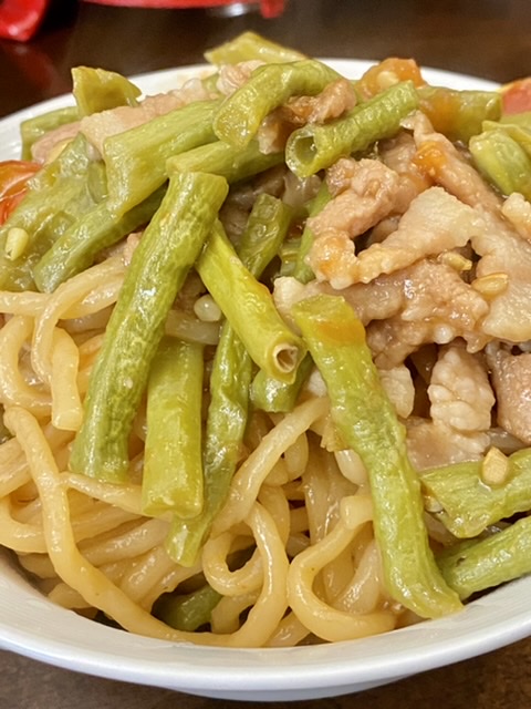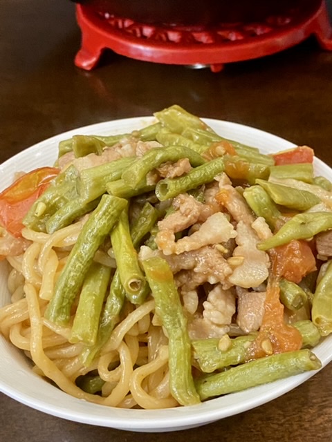 再焖。用葱、蒜、酱油,豇豆,西红柿,肉丝。