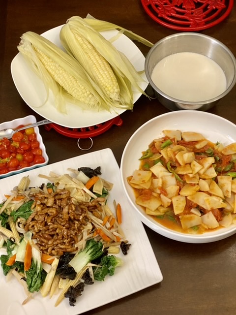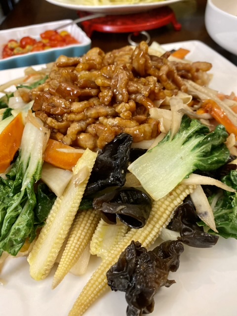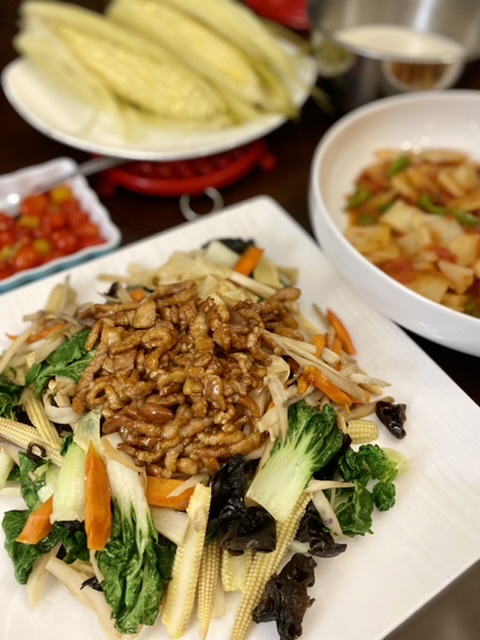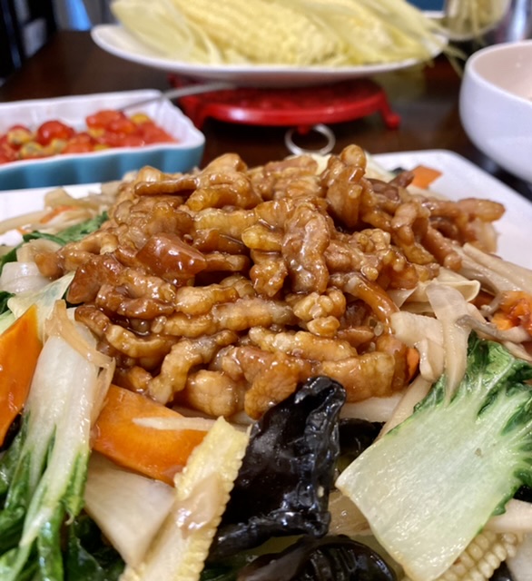 下面有上午买的玉米笋,想做荷塘小炒。但后来怕素了点,切点肉丝炒了放上面。