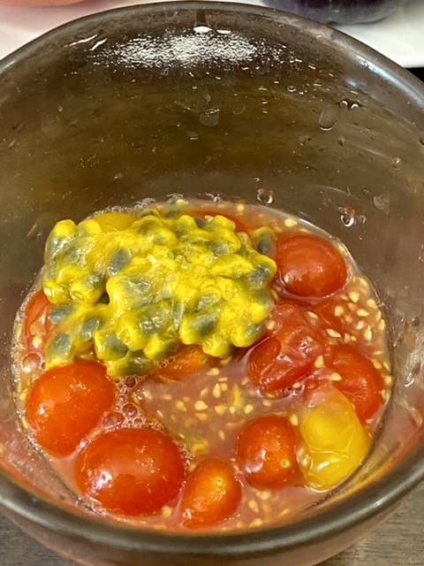 我用这个小珍珠番茄代替小番茄,擀面杖一头压碎,半个百香果。