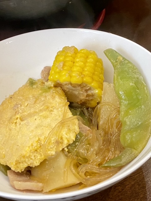 土豆、玉米、油豆角、粉条,肉配猪排骨、腔骨、五花肉。不能是其它肉类,更不是bacon。