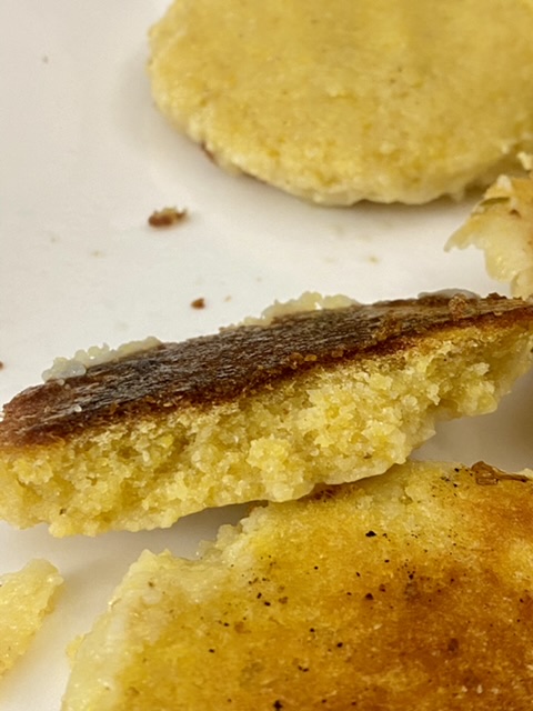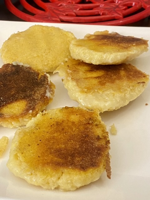 玉米饼子用平底锅水煎,放一点淀粉糊。