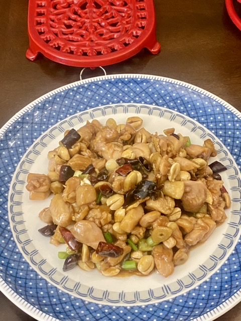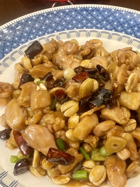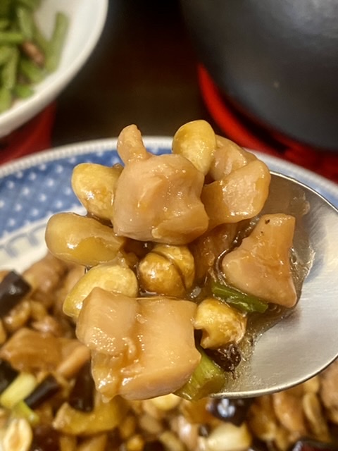 宫保鸡丁是带皮去骨鸡腿肉,切丁,用酱油和粗粒地瓜粉抓一下。