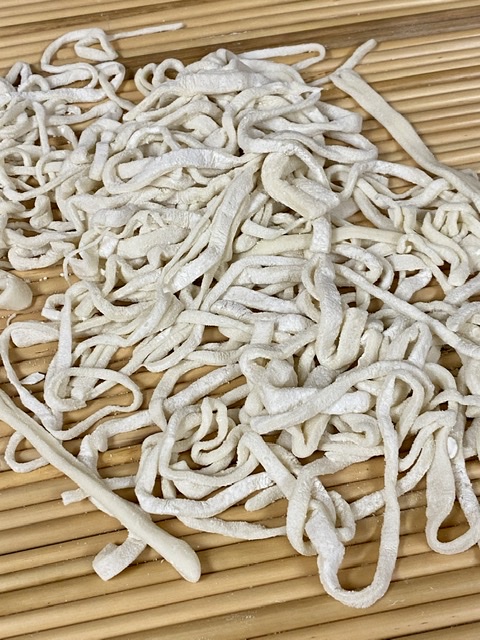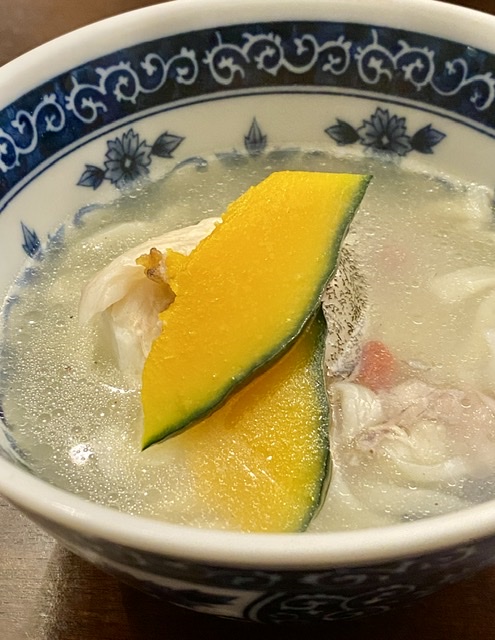 鱼汤白了,先放南瓜片,甜白菜,水开下面条。