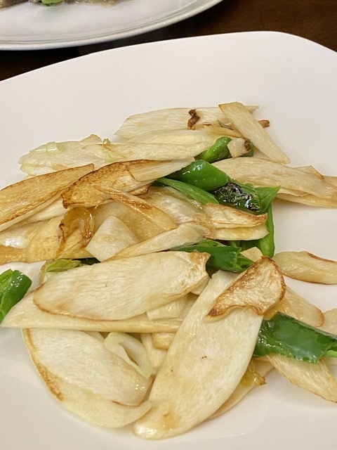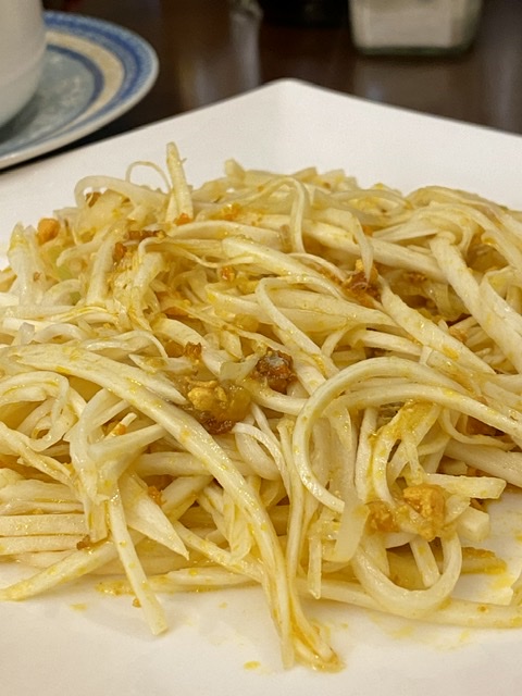 茭白切丝焯水,蟹粉罐头热一下浇上即可。