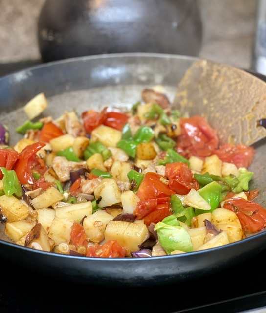 用五花肉片的油就行了,土豆、茄子、西红柿、青椒(麻椒)。