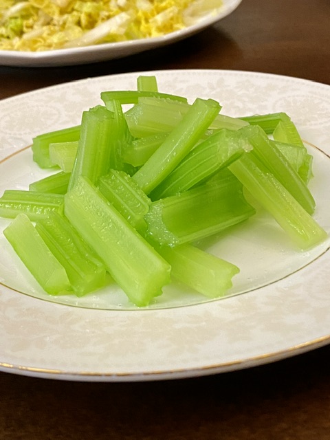 芹菜水焯30秒,非常嫩,撒几粒盐就可以。