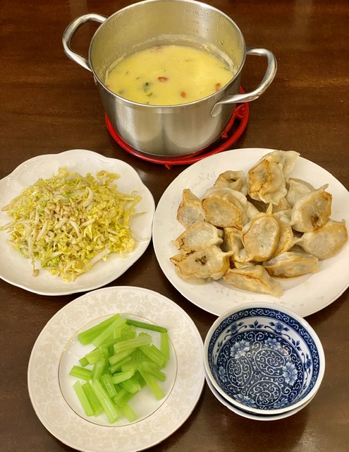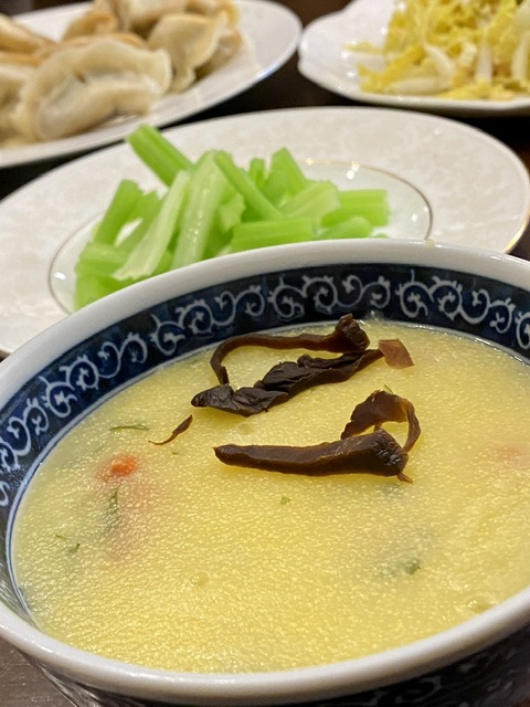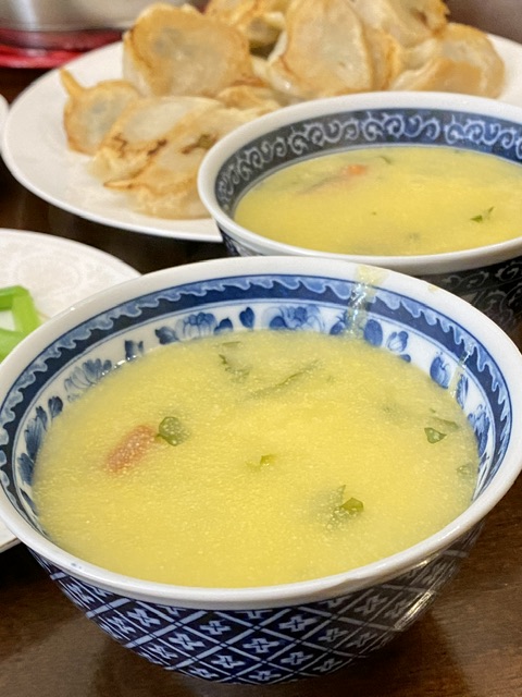焯芹菜的水直接做玉米面粥,加了切碎的芹菜叶,枸杞。