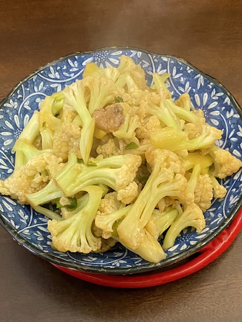 鸡油化了,葱花也香了,菜花一面也炒黄了,翻面,撒点盐,盖盖子,