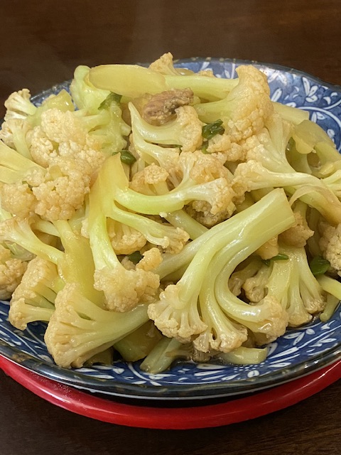 菜花自己析出水分,菜就焖透了,一点酱油,薄芡。