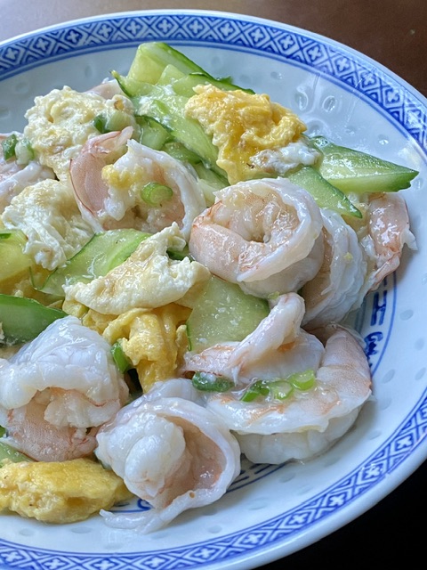 另放葱花,虾、黄瓜片,鸡蛋下锅,勾一点芡。