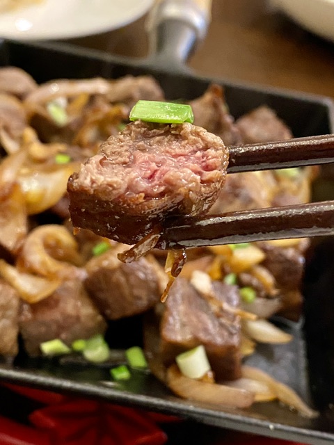 平底锅烧很热,直接下牛肉粒,没有盐、没有腌。