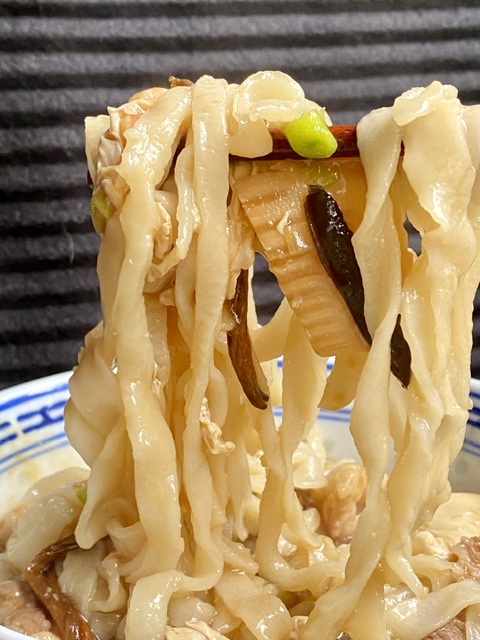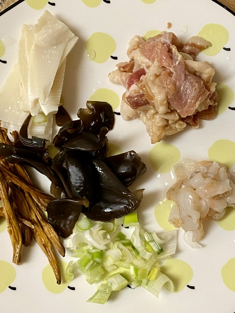 今天的打卤面里,有肥肉片,里脊肉片,黄花,木耳,笋片,虾丁。