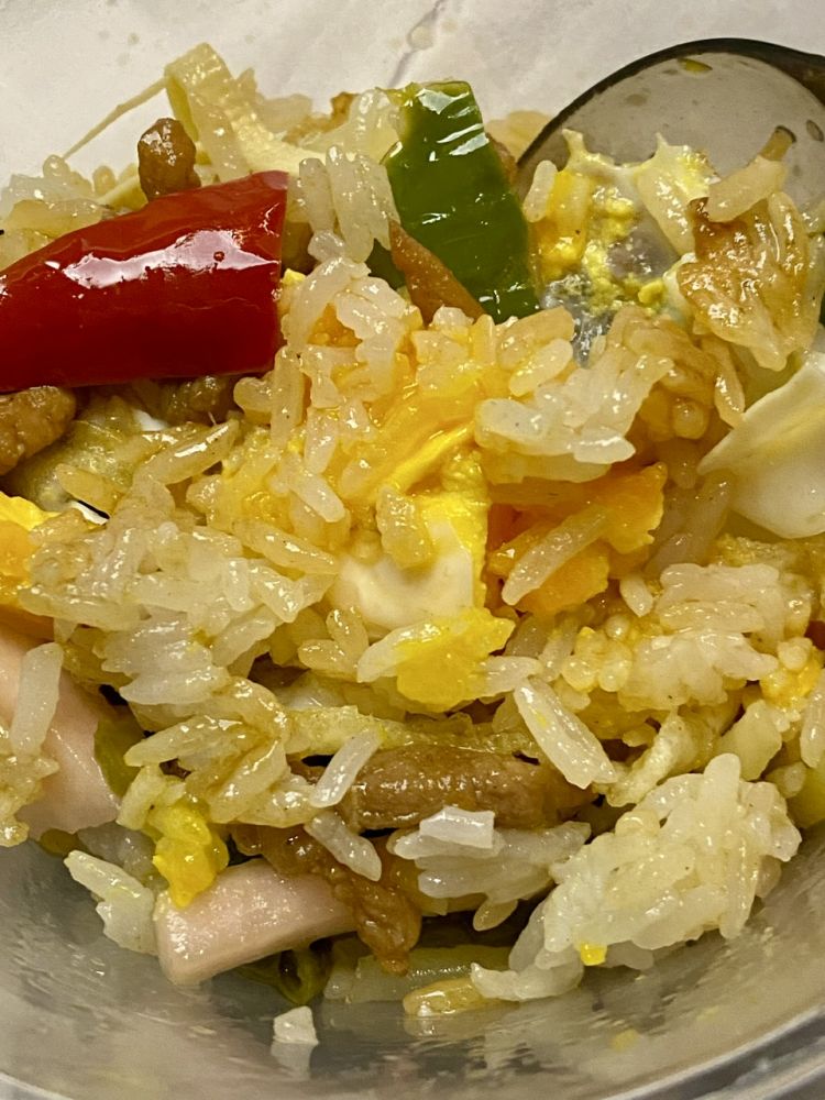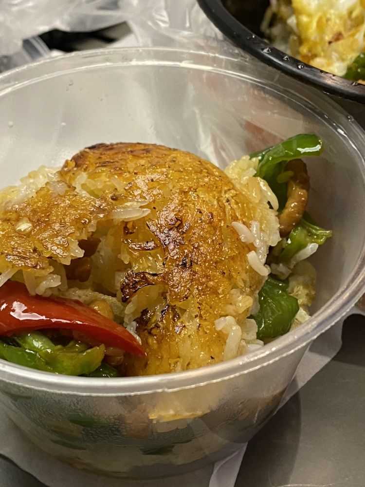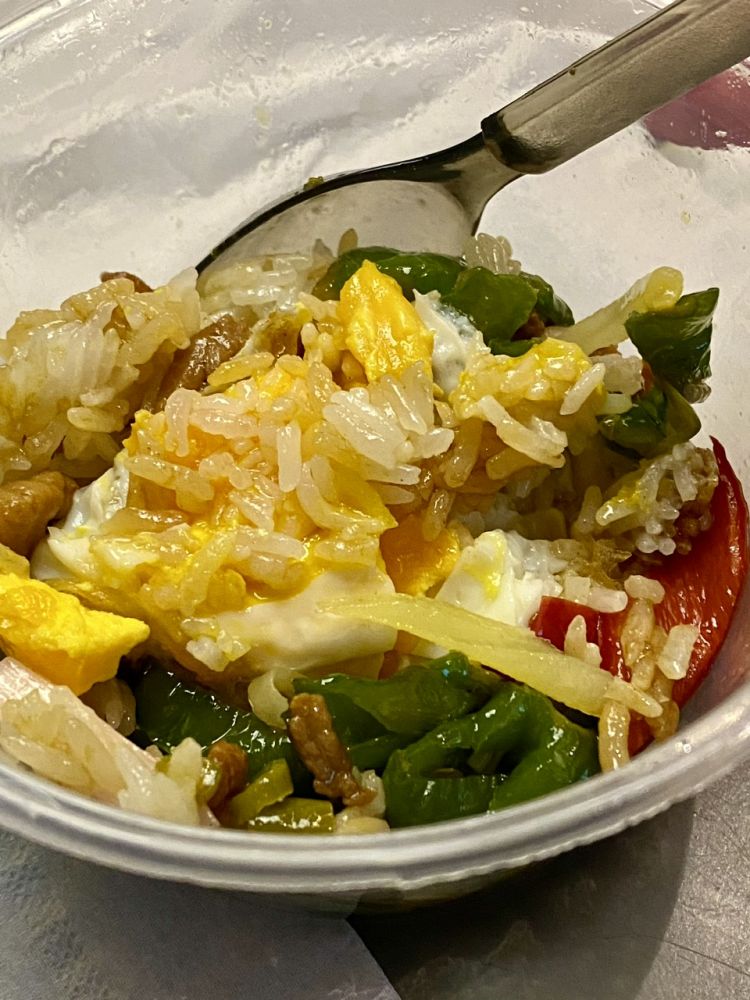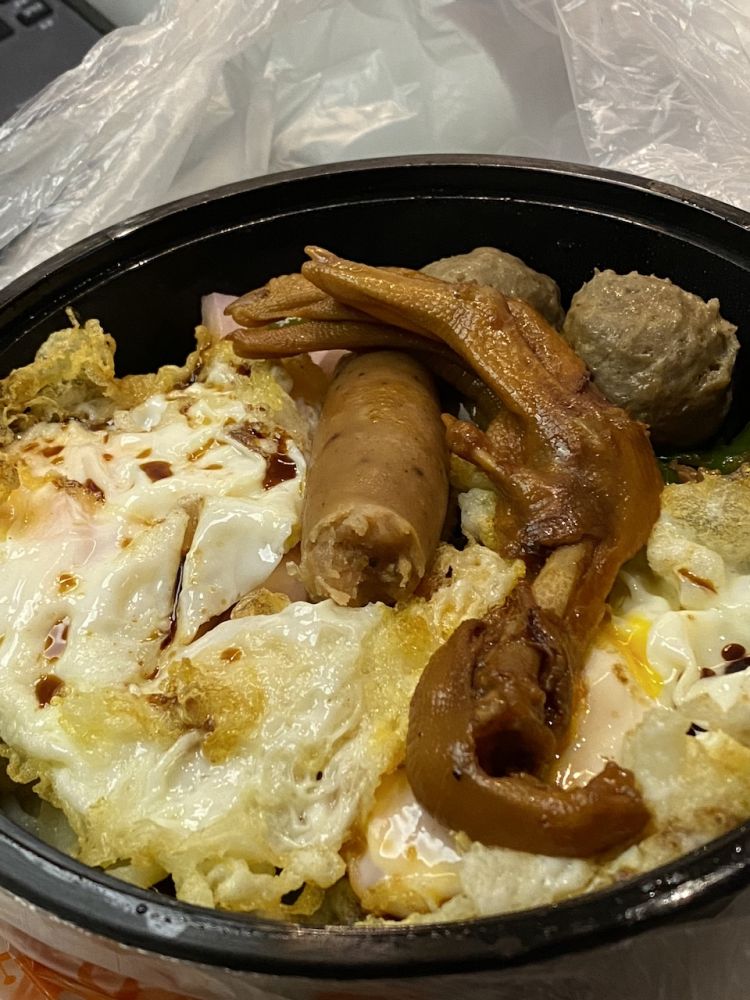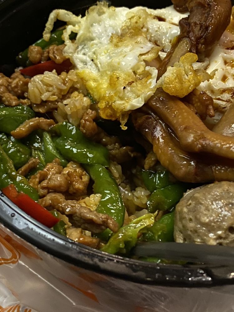 买的辣椒炒肉煲仔饭,加蛋、酸萝卜、鸭掌等。是辣椒炒肉。