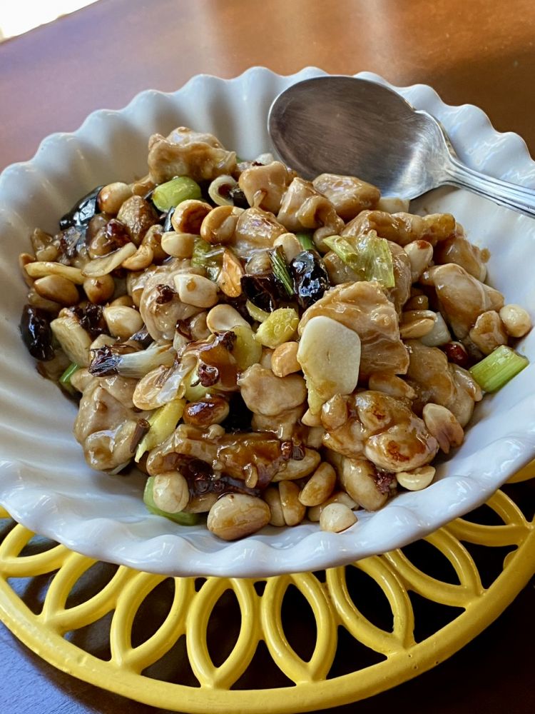 炒的时候,先放干辣椒,糊一点,放干花椒,然后葱姜蒜,鸡肉,熟了以后,下碗汁,最后加葱段和花生米。