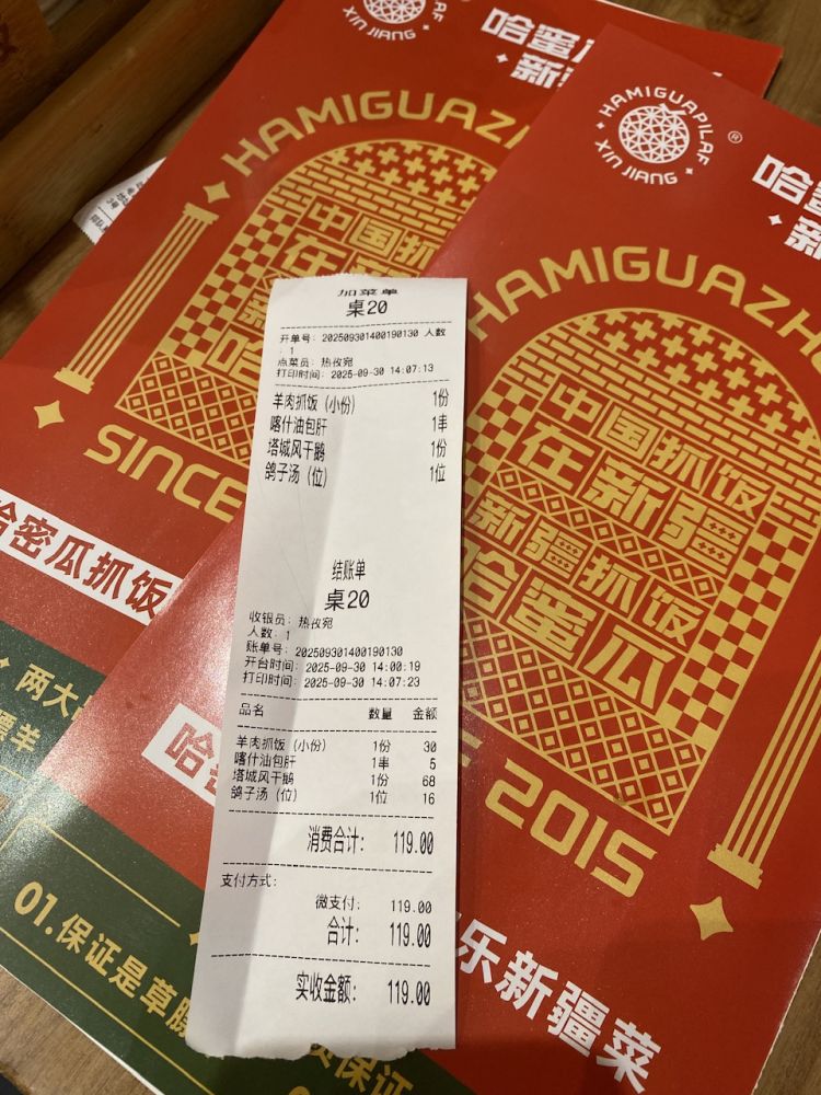 抓饭还行,我觉得没有和田二街的努日曼那家的好吃,不过也是好吃的。肉也不膻,不过抓饭上的肉,都没有直接吃手抓羊肉的嫩,可以理解,因为油煎,再跟米饭一起焖过,就没有手抓羊肉做法那么火候短。