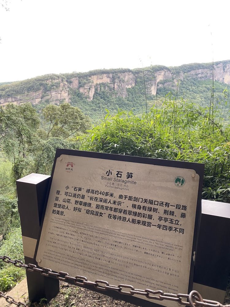 剑门关这里的山景一般,比4月浙江行的雁荡山、神仙居都差远了,只有一个类似的巨石还被命名石笋峰,而张家界、浙江的,都比这里的地貌精彩多了。