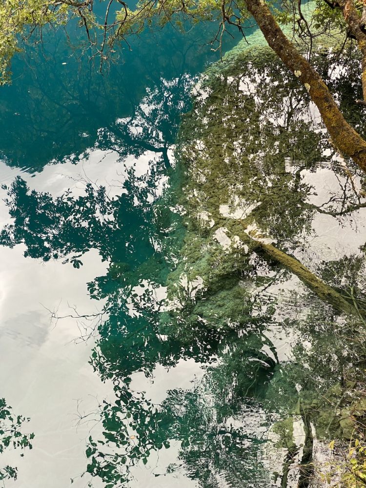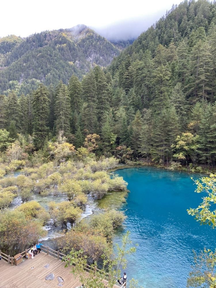 这里就是俯瞰的一连串海子的内部。在这条路上,看到了九寨沟真正的居民:植物,泉水、矮脚鹿、钙华堤、树珊瑚......