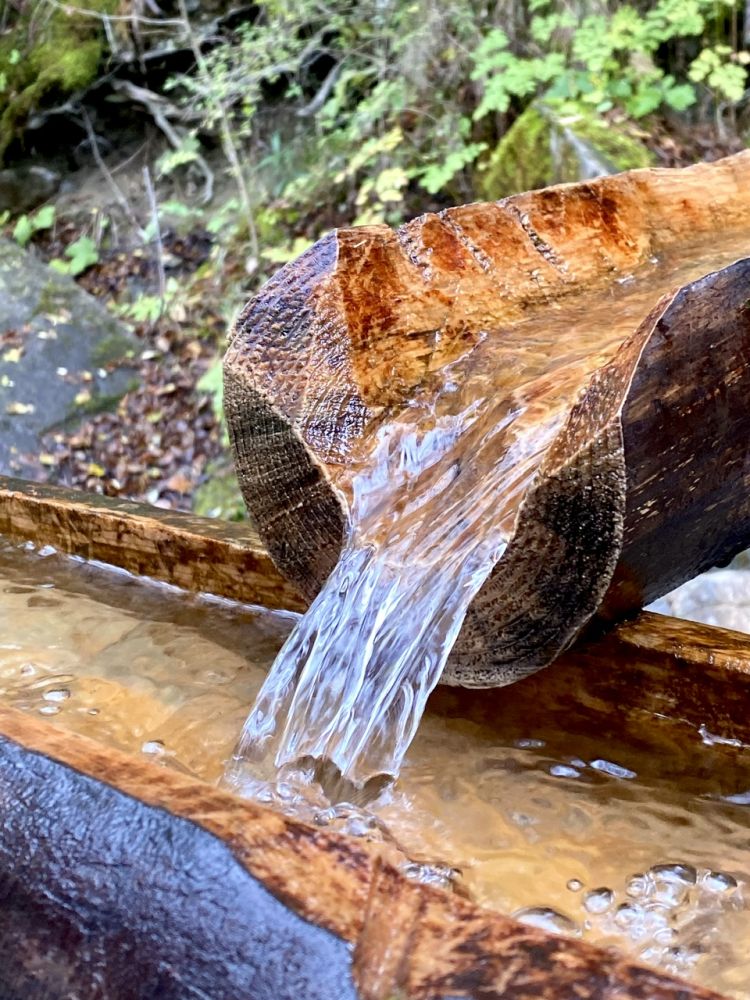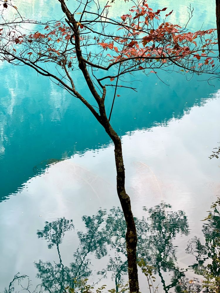 犀牛海和老虎海的步道,走到这里时,天晴了,水是果冻一样的蓝色,水边有秋叶的地方,随手一拍就是很好看,大自然的配色。