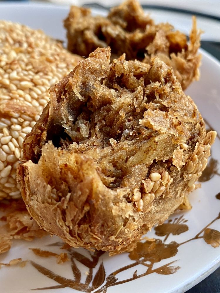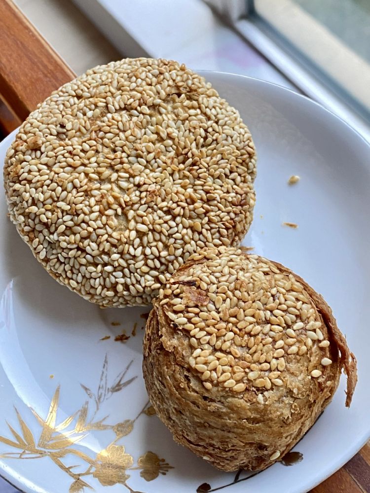 大的是普通芝麻烧饼,小的茴香籽味儿重,外酥里嫩,一咬掉渣儿。